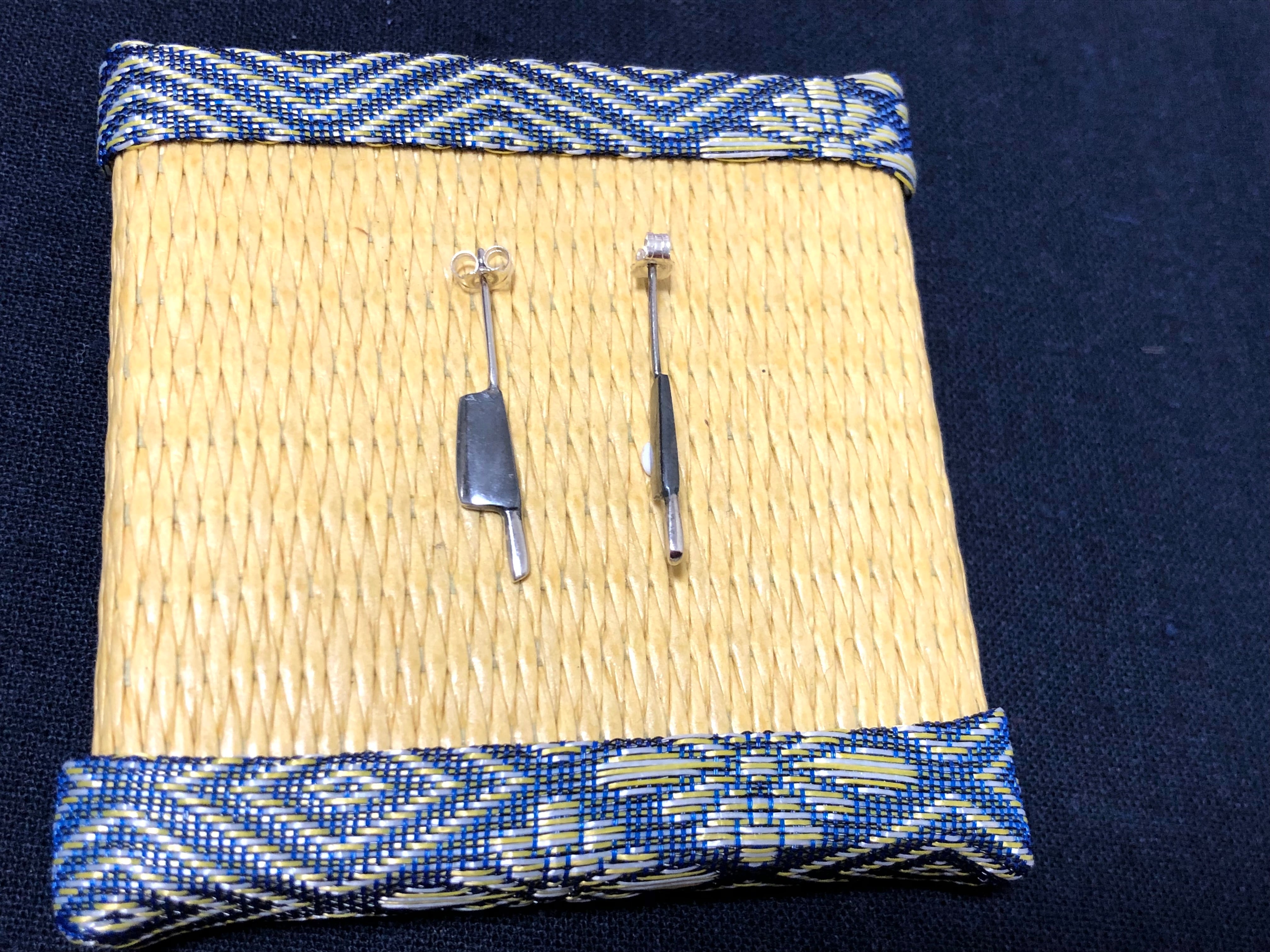 silver925で鋳造した武器ピアスを一点一点を手磨きして燻し磨きで仕上げています。